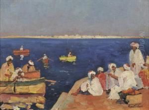 Fishermen In A Boat On A Lake With Figures On The Shore, Mountains Beyond