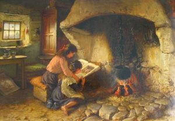 A Cottage Interior With Two Children Reading A Book By The Fire