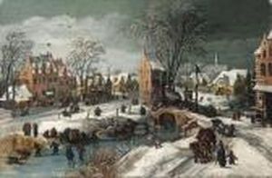 A Winter Landscape With Travellers And Peasants By A Bridge