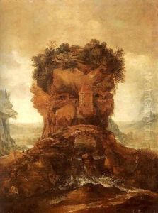 A Mountainous Wooded Grotto With Figures Resting And Catching Fishby A Waterfall