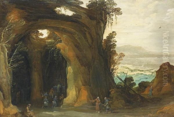 A Landscape With Pilgrims Attending Mass In A Grotto