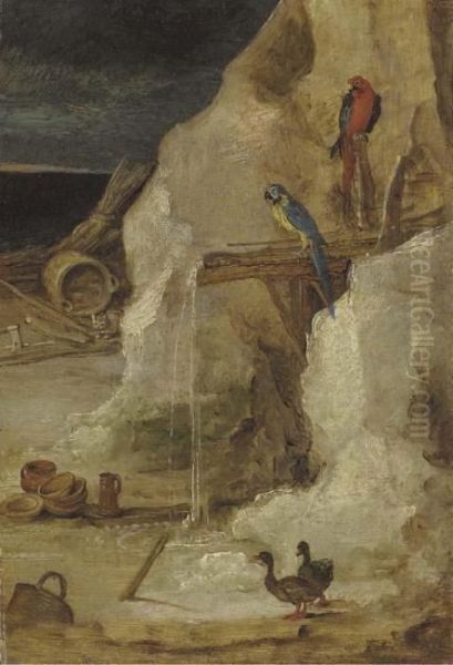 A Rocky Landscape With Parrots And Ducks