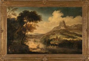 A Mountainous Wooded River Landscape With A Waterfall And Buildings, Figures, Horsemen, A Goatherd And Goats On A Path