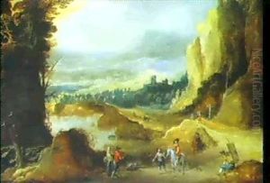 A Mountainous Landscape With Travellers On The Edge Of A Town