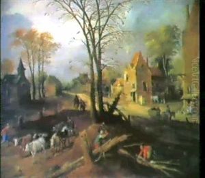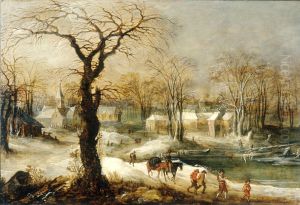 A Village Landscape In Winter With A Woodchopper And Figures On A Road Beside A River In The Foreground