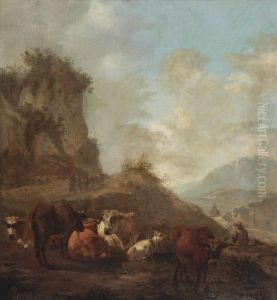 A Mountainous Landscape With Travellers And Herdsmen On A Path