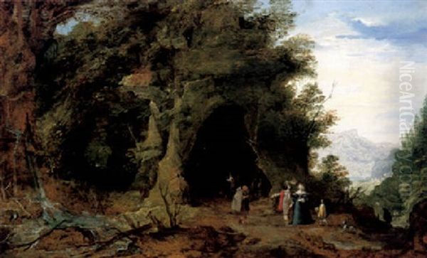 A Wooded Landscape With Elegant Figures And A Monk Before A Grotto