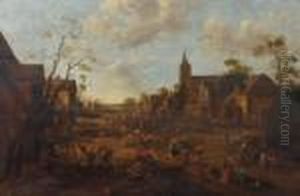 A Busy Village Scene With Numerous Figures, Near A Churchtower