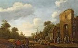A Village Scene With Peasants Drinking Outside An Inn, Otherfigures Resting Beneath A Tree