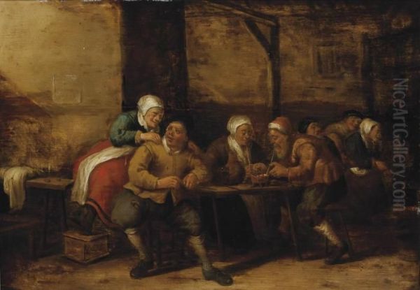 A Barn Interior With Figures Packing Their Pipes And Sitting Around Tables
