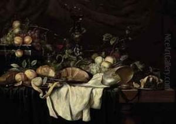 Grapes, Peaches, Plums, Lemons, Oranges, A Conch, An Ornamentalroemer, A Ham, A Minced Pie And A Gilt Locket On A Green Velvetcord, On A Wooden Table With White And Green Drapes