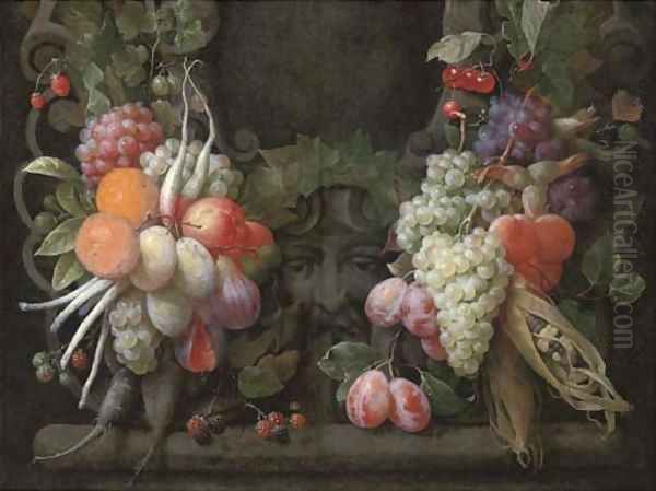 Grapes, gooseberries, blackberries, figs, oranges, plums, radishes, asparagus, maize, cherries and other fruits surrounding a stone cartouche