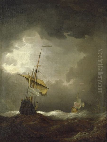 Franzosisches Und Englisches Segelschiff In Schwerer See