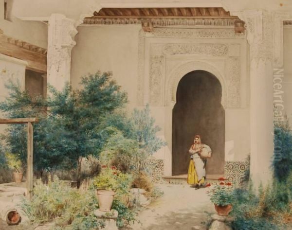 Girl Carrying A Water Flagon To A Well In A Spanish Courtyard