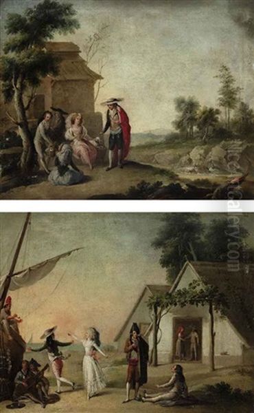 An Elegant Couple Dancing The Bolero (+ Elegant Figures In A Landscape; Pair)