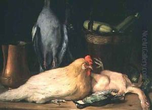 Still Life With A Melon, Radishes, Partridges , A Small Barrel And A Bottle Of Wine On A Wooden Table