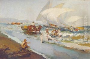 Ninos Jugando En La Playa, Junto A Las Barcas