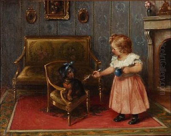 Interior With A Little Girl Feeding Her Dog