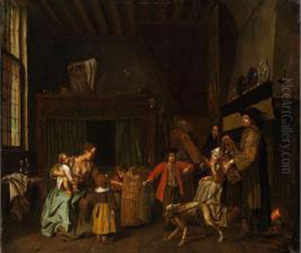 Genreszene In Burgerlichem Interieur Mit Einem Leierkastenspieler