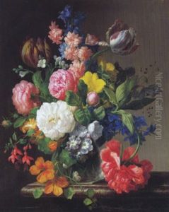 Damask Roses, Bourbon Roses, Michaelmas Daisies, Nasturtiums And Polyanthus Primulas In A Vase