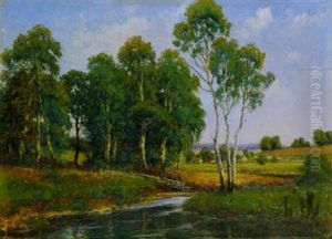 Sommerliche Voralpenlandschaft Mit Baumen Am Bachufer
