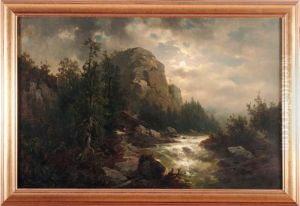 A Mountainous Landscape With A Traveller Near A Torrent