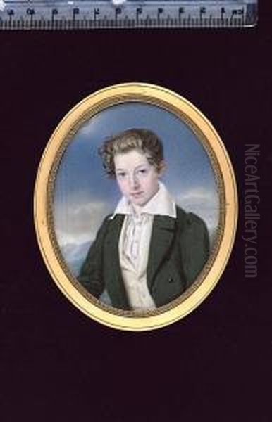 A Boy, Wearing Dark Green Coat, Cream Waistcoat And Pleated White Chemise With Wide Collar