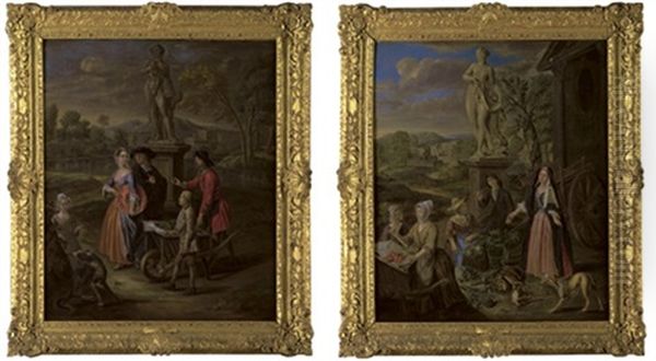 A Vegetable Seller And His Son Offering Wares To A Lady And A Cleric By A Statue Of Bacchus (+ A Vegetable And Fruit Market By A Statue Of Venus, With A Town By A River Beyond; Pair)