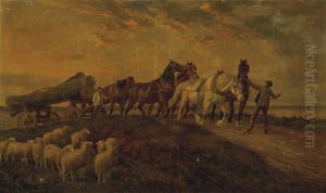 Horses Pulling Logs, Sheep Resting In The Foreground