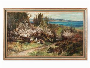 Schottische Fruhlingslandschaft Mit Ruhender Schafherde Unter Bluhenden Buschen Und Blick Auf Gewasser