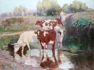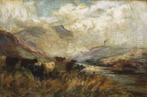 Sommermorgen Im Schottischen Hochland Mit Weidenden Schafen Und Katarakt Oil Painting by Joseph Denovan Adam