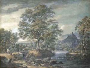 An Extensive River Landscape With Travellers