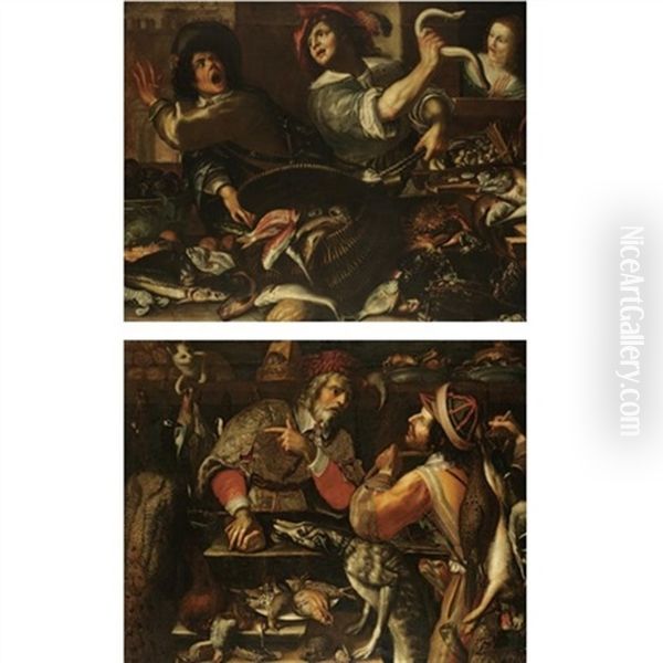 A Larder Still Life With Fish And Shellfish, Two Young Men Arguing Watched By A Girl Behind (+ Another; Pair)