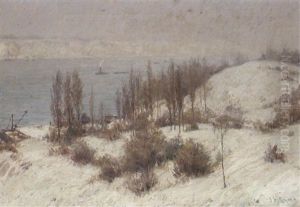 Winterliche Flusslandschaft Mit Lastkahnen