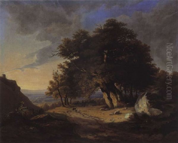 Romantische Mittelgebirgslandschaft Mit Grosser Eichengruppe Und Jagerstaffage