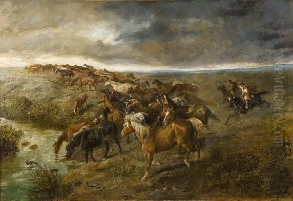 Horsemen Driving Wild Horses Beneath Broodingskies