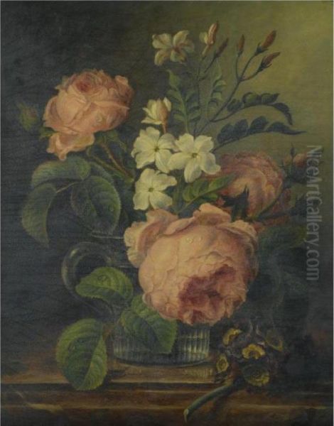 A Still Life With Roses And Narcissi In A Glass Beaker Together With A Sprig Of Primrose On A Marble Ledge
