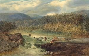 A River Landscape With An Artist Sketching Ona Rock Mid-stream