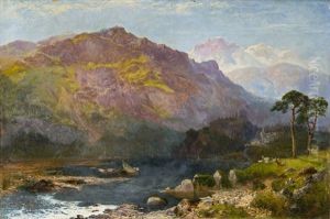 Extensive River Landscape (lake District?) With Boys Playing On A Swing By The River Bank, With Haymakers In The Distance