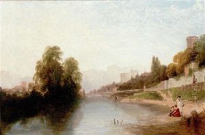 A River Landscape With An Artist Sketching On A Rock Mid-stream