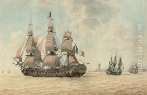 < Fregate Anglaise Vue Par Le Trois-quart Arriere Tribord, Naviguant Tribord Armures Sous Voilure Reduite Et Se Preparant A Croiser Un Navire Venant Au Vent Par Tribord, Naviguant Vent Arriere >.
