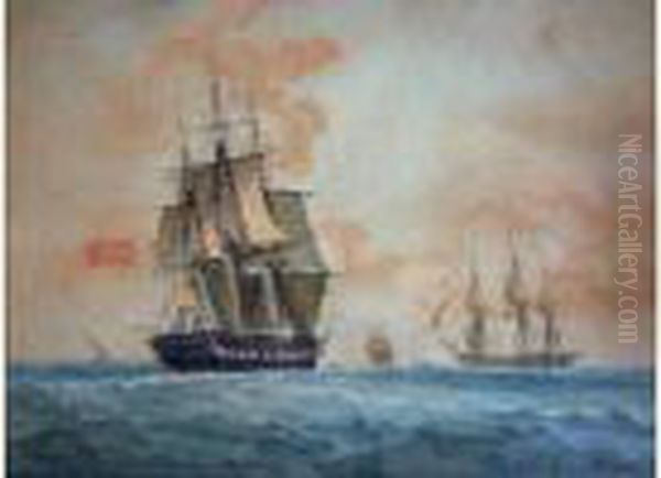 < Fregate Anglaise Vue Par Le Trois-quart Arriere Tribord, Naviguant Tribord Armures Sous Voilure Reduite Et Se Preparant A Croiser Un Navire Venant Au Vent Par Tribord, Naviguant Vent Arriere >.