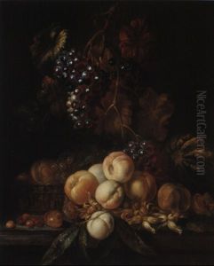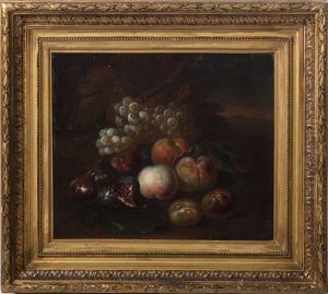 Still Life Of Melon, Peaches, Pears, And Grapes On The Vine In A Basket