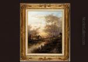 Figures By A Stream With Cottages And Woodland