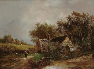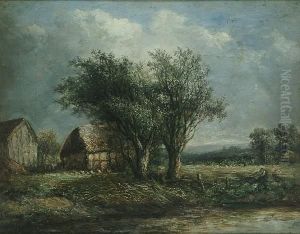 Country Landscape With Timbered Cottage In The Foreground, A Figure On A Track