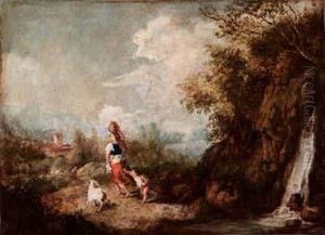 Paysage avec personnages et chute d'eau