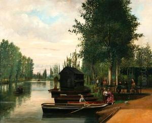 A Tranquil River Scene With Ladies By A Boat