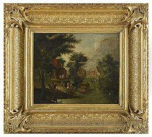 A River Landscape With Travellers And Figures In Boats, A Village Beyond