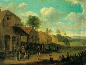 A Village Scene With Travellers In A Horse-drawn Wagon, Together With An Elegant Couple And A Servant Pouring Tea