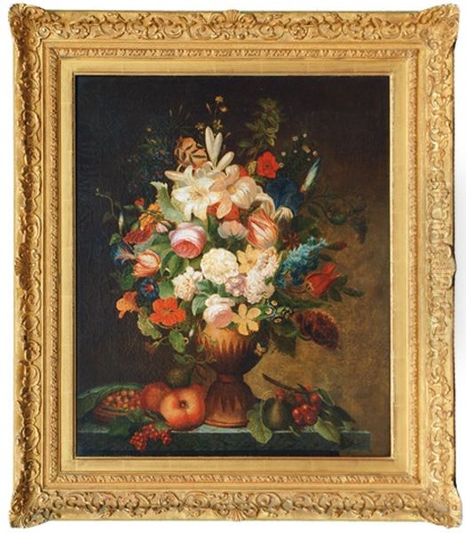 Flower Still Lives In Metal Vases On Marble Pedestals (+ Another; Pair)